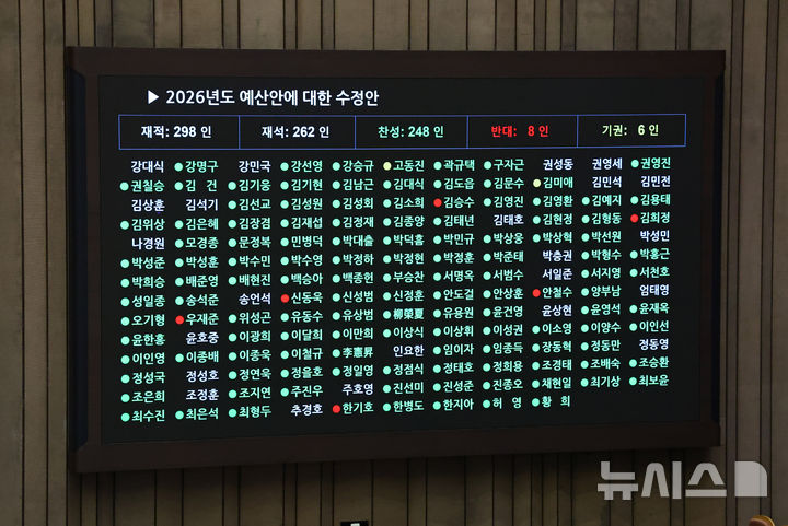 2026년도 예산안이 12월 2일 국회 본회의에서 재석 262명 중 찬성 248명, 반대 8명, 기권 6명으로 통과되었습니다. 총지출 규모는 정부 원안 728조원에서 약 1000억원 감액된 727조9000억원으로 확정되었으며, 총수입은 674조2000억원에서 1조원 증가한 675조2000억원으로 조정됐습니다. 이번 예산안은 올해 본예산보다 8.1% 증가한 역대 최대 규모로, 5년 만에 법정 처리 시한(12월 2일) 내에 통과된 사례입니다.